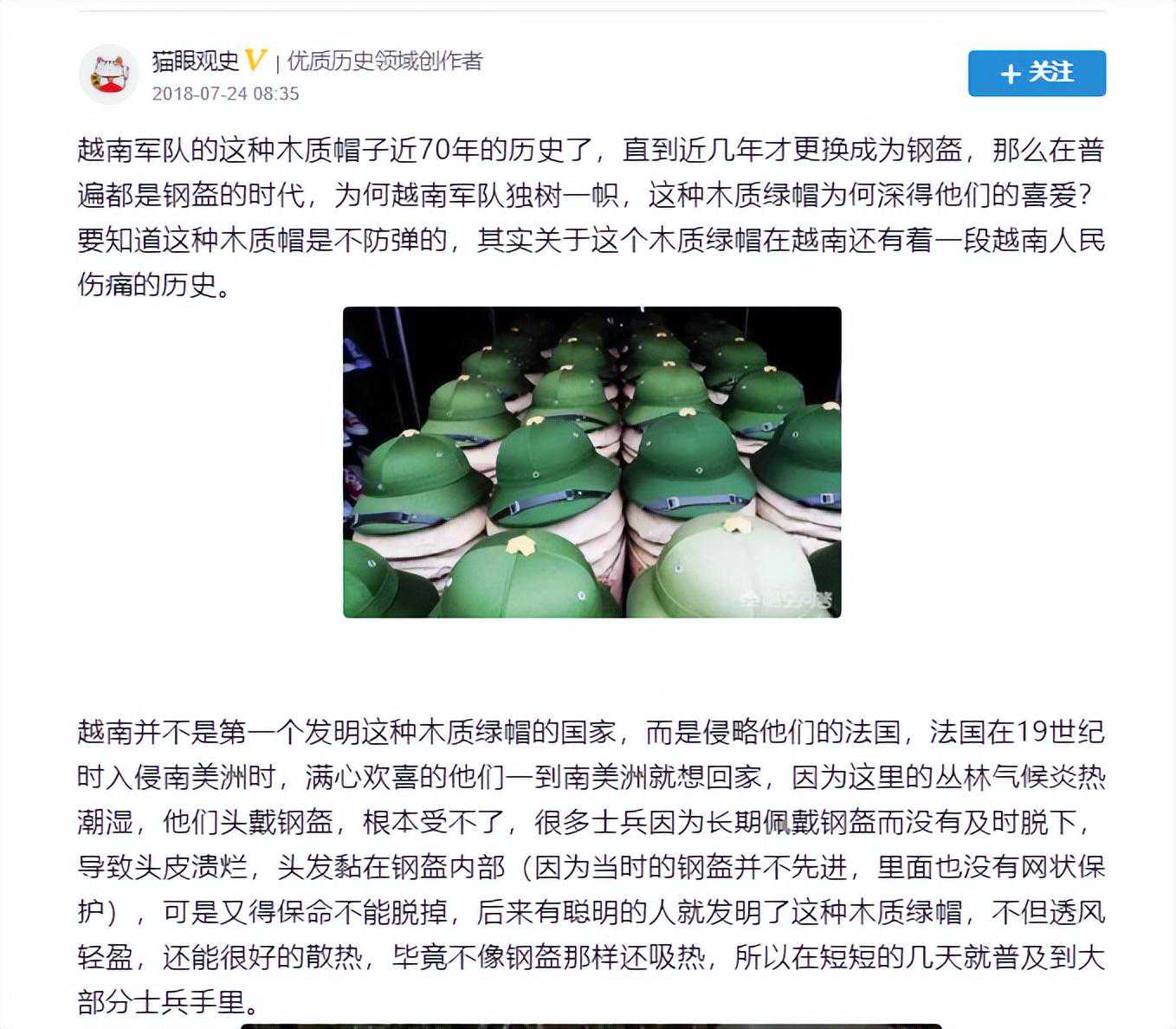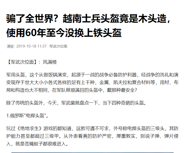 最后看个越南的,大体上也是,为何越南士兵戴木头头盔,而不戴钢盔。很多人对这个越南人民军戴木制头盔一顿神解释,什么气候、环境之类的,解释一大堆。