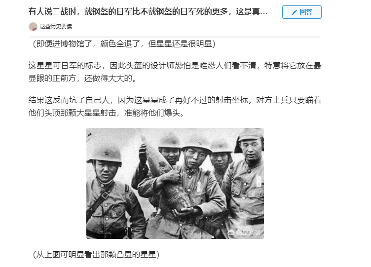 这个老营销号对日军钢盔的描述也是如此,日军钢盔上有个星星,瞄着星星打,这星星还是红色的..拜托,找个二战日军钢盔的照片这么难么?