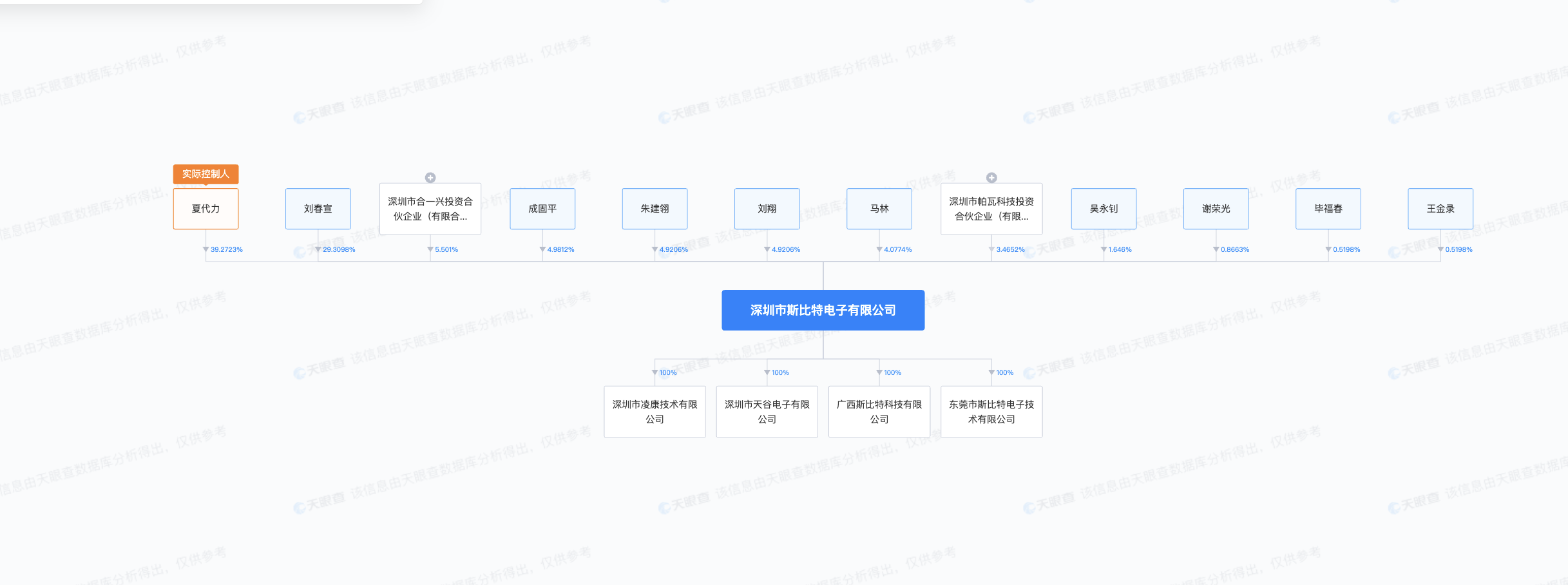 天眼查信息显示,斯比特的前身为深圳市斯比特电子有限公司,成立于2004年2月。目前,该公司的注册资本为7357万元,法定代表人为夏代力,股东包括夏代力、刘春宣、刘翔、成固平等。