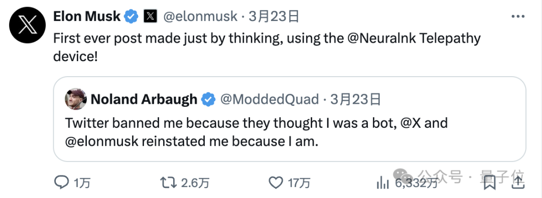 在推文中,他称一开始(由于意念操作)还被平台判定为机器人,然后就被禁了。