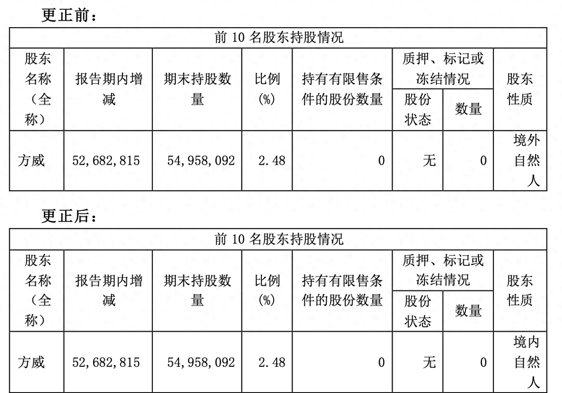 吉祥航空在公告中表示,由于工作人员疏忽勾选错误选项,导致年报中披露的“前10名股东持股情况”部分内容有误,现对相关内容进行更正:将方威的“境外自然人”改为了“境内自然人”。