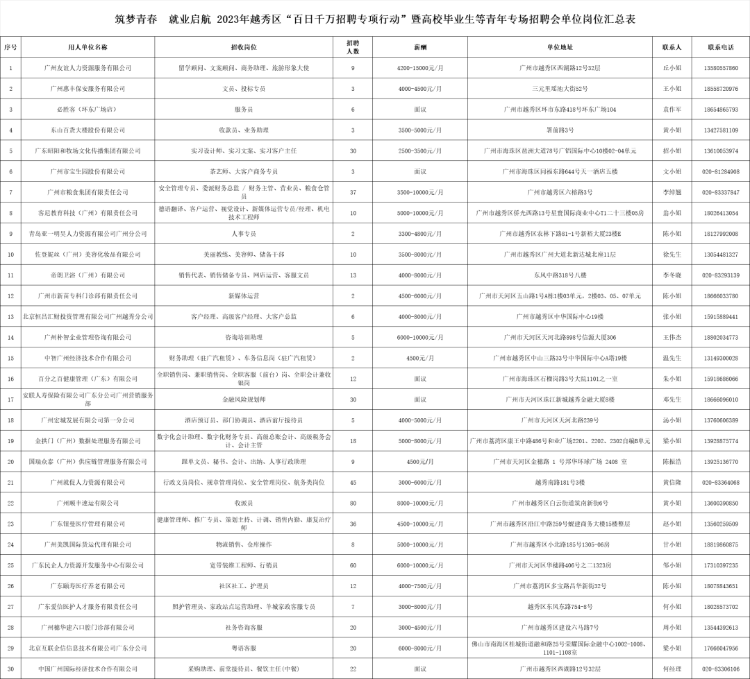 @正在找工作的你越秀招聘上新了~明天下午就在越秀区人力资源服务产业园30家企业、500多个岗位等你来~先看看有没有你心水的“笋岗”↓↓↓01活动主题筑梦青春•就业启航02活动名称2023年越秀区“百日......