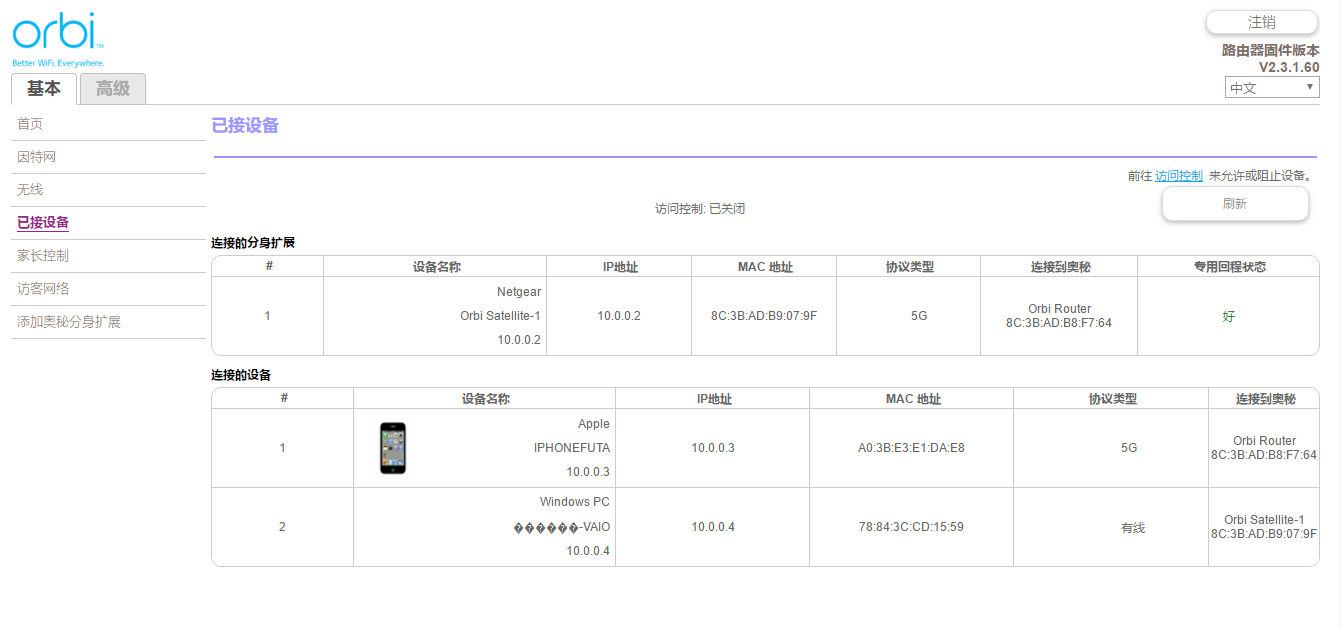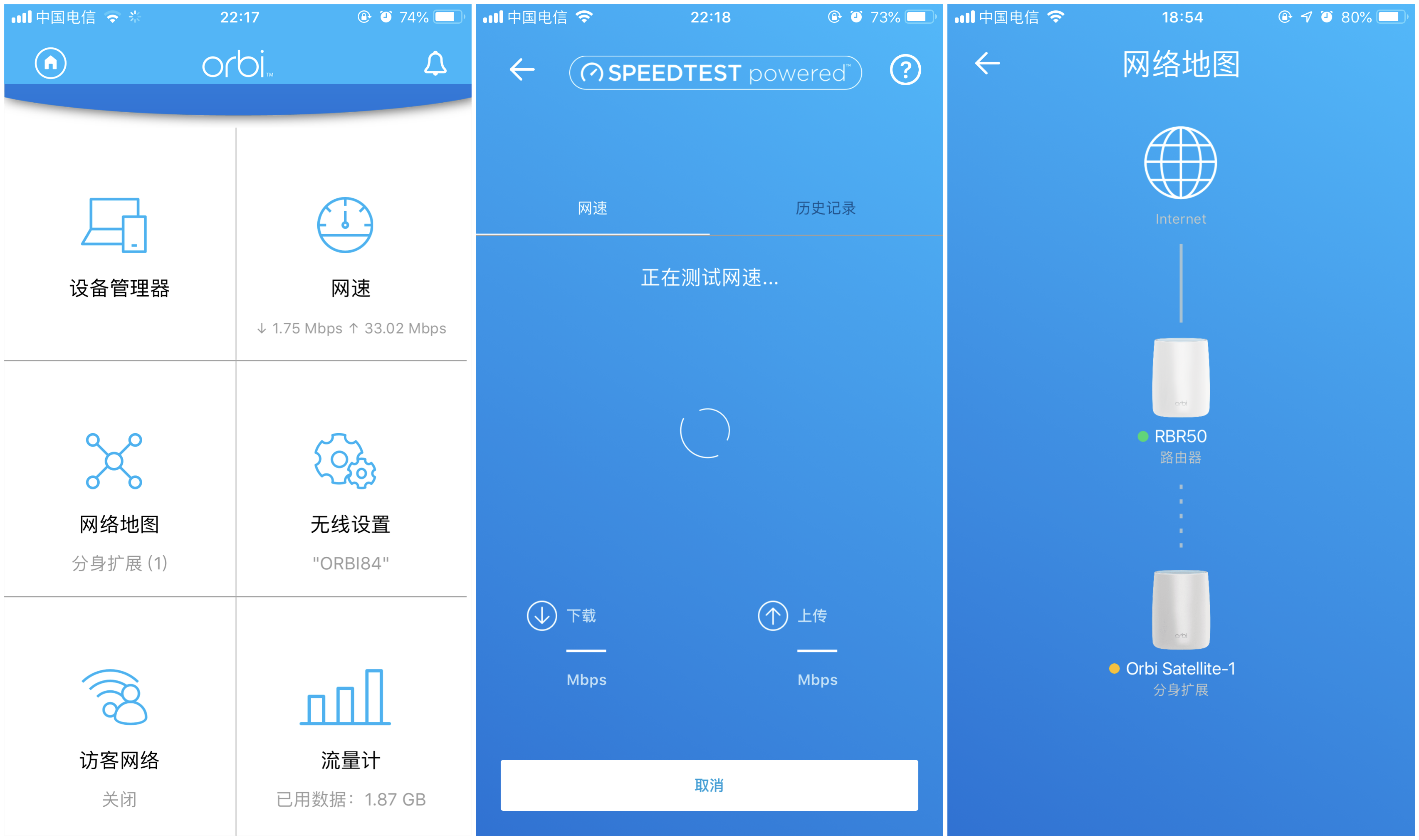 OrbiRBK50APP操作相对来说比较简单,在主界面可以一目了然可以查看连接WiFi的设备以及测量网速的快慢,对于WiFi进行修改设置等;另外还可以查看主路由以及分路由的工作状态并用不同颜色灯来显示,以及有客人来到家里可以打开访客网络给客人连接使用WiFi。