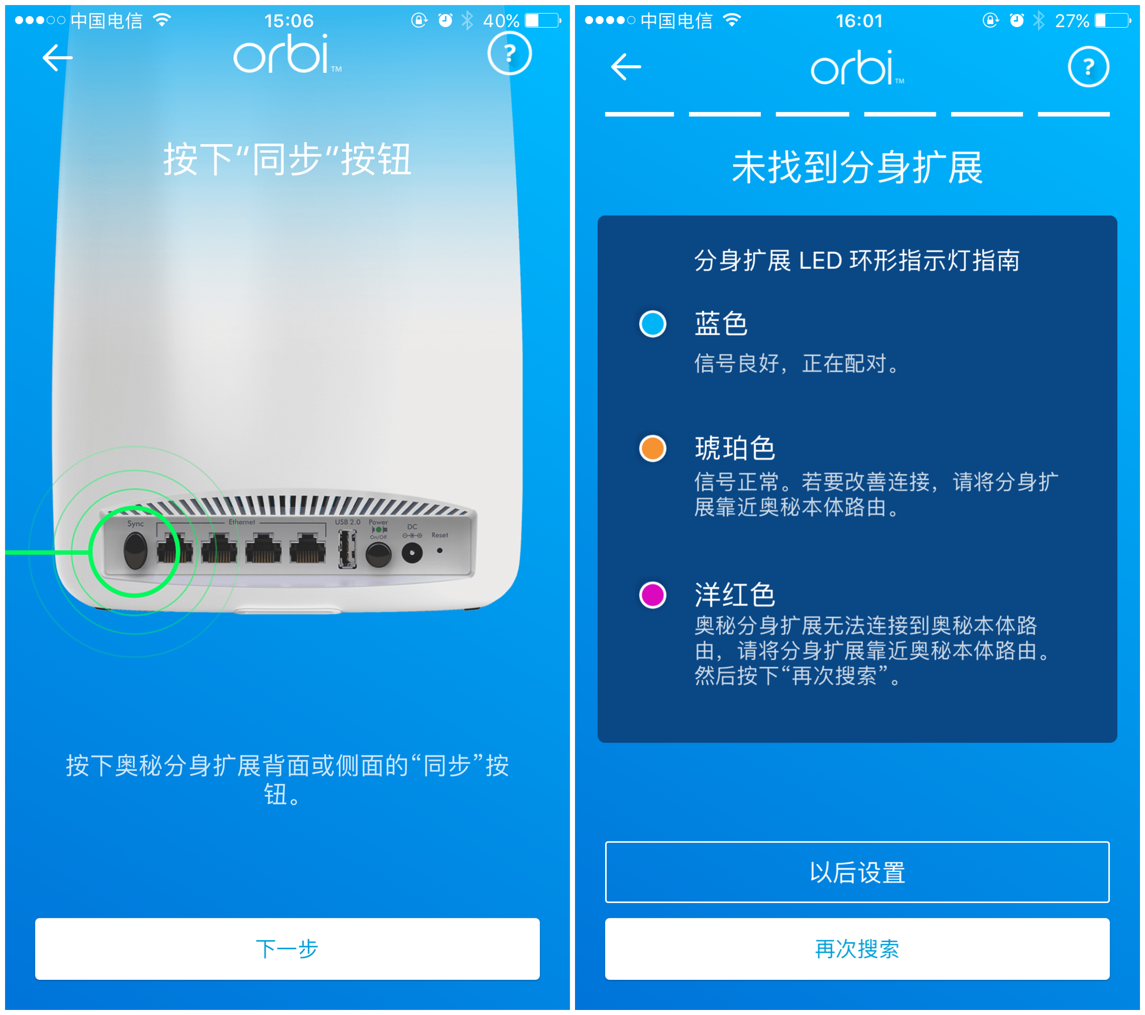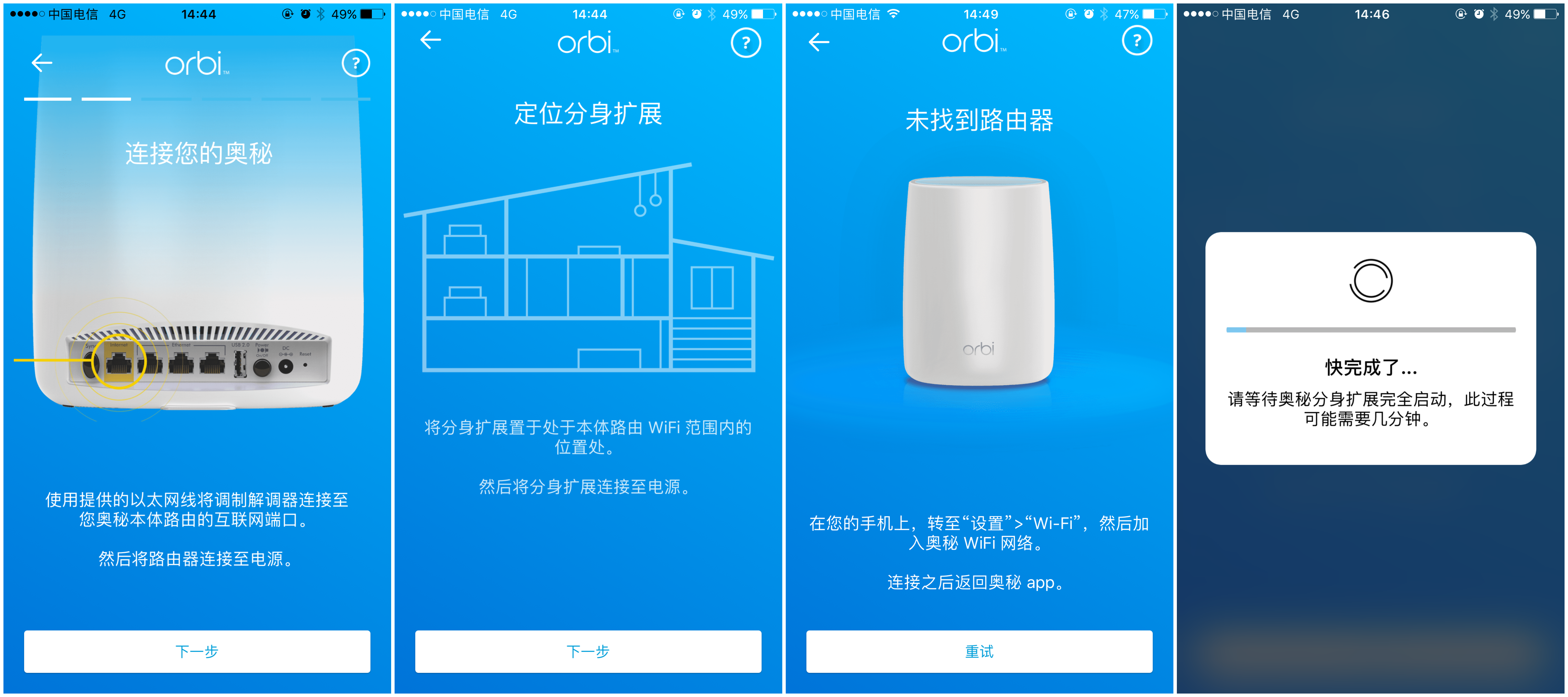 在进行网络连接时最好把2个路由器放在一起设置最好,减少运动量。首先设置的就是主路由器由于我家不需要网路账号登录直接插上去就可以使用网路还是比较简单的,需要下载orbiAPP注册账号,在APP中扫描底部的二维码才可以进行匹配,稍微有点麻烦的就是在连接过程需要切换WiFi连接成ORBI84才能进行。