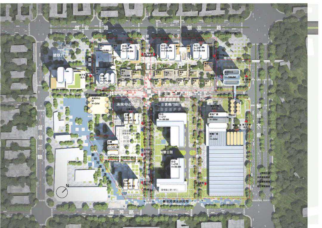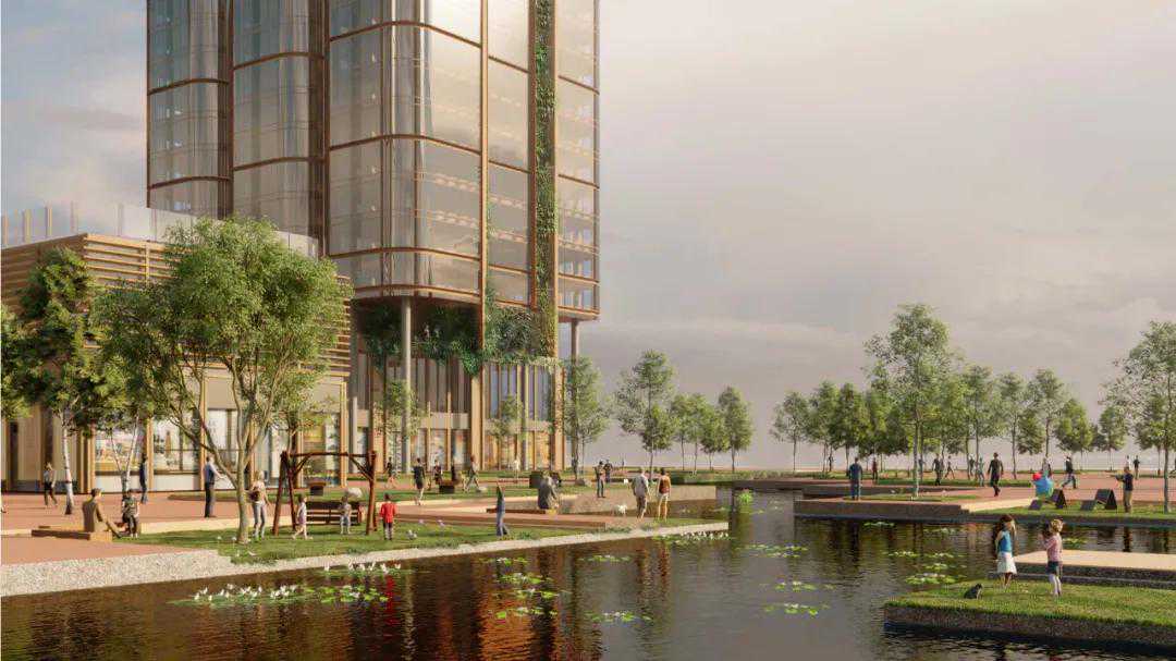 创新产业平台升级——绿色产城“城市花园”。产业升级是推动城市创新转型的核心驱动力。基于华润置地“以创新为核心势能”“以生活为发展指向”“以共赢为价值准则”的产城融合发展愿景,Aedas提出了绿色产城“城市花园”的设计概念。