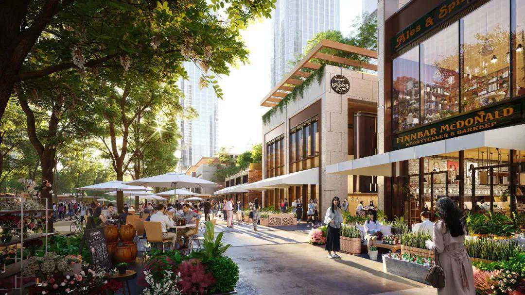 设计以啤酒为主题,在片区核心空间营造小镇的沉浸体验。设计规划出分别承载雪花旗下,国际和自主啤酒品牌的花园道与啤酒街,亮点为街道对面的三个公共广场。
