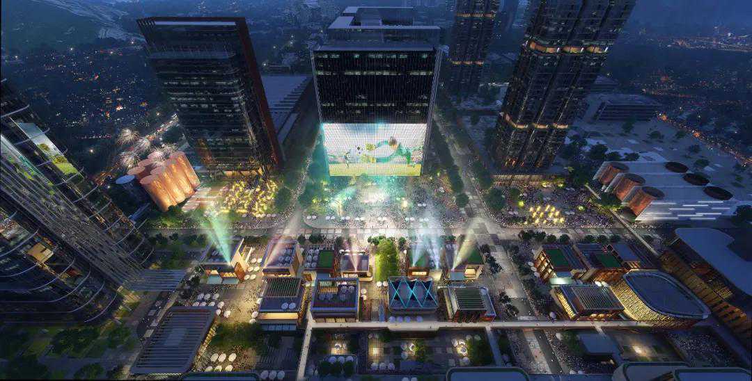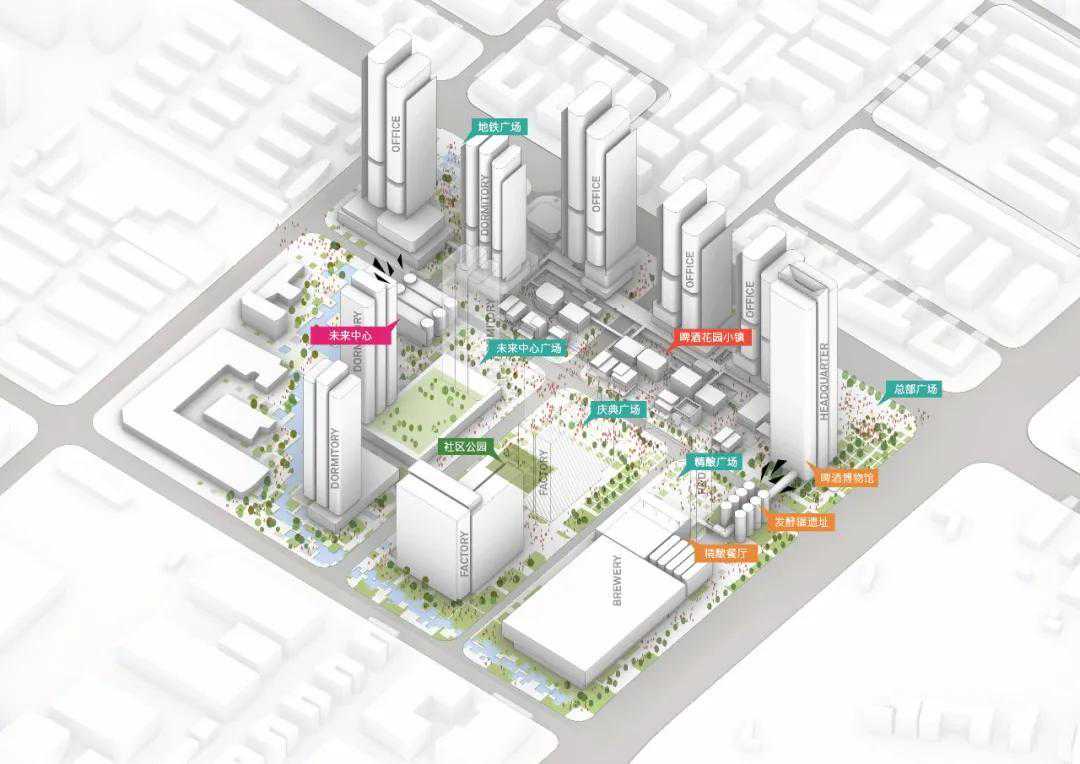 设计以绿色宜居环境,为新型产业升级赋能。通过塔楼布局的移位调整,在片区中部形成东西向的活力轴,依次设置未来中心广场、庆典广场、精酿广场,营造大量公共空间,在产业云集的高密度城市环境中,形成尺度宜人且具凝聚力的城市核心。