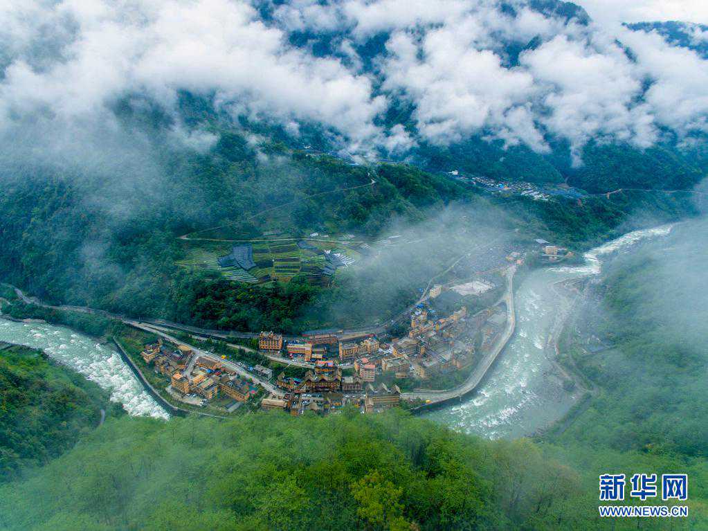 云雾缭绕的云南贡山独龙族怒族自治县独龙江乡(2019年4月16日摄,无人机照片)。新华社记者江文耀摄