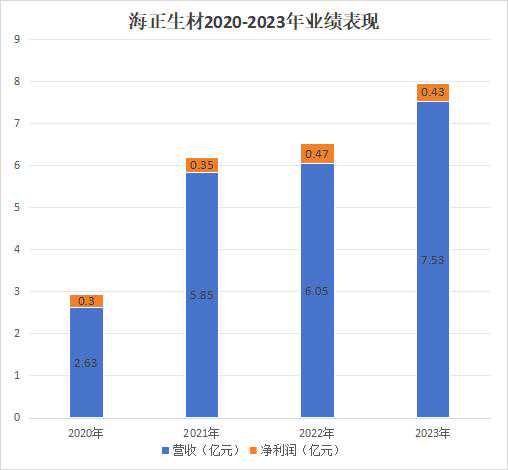 在业绩表现方面,海正生材在上市前后均保持着增长态势。招股书及财报数据显示,2020年-2022年,公司实现营业收入分别为2.63亿元、5.85亿元、6.05亿元;净利润分别为0.3亿元、0.35亿元、0.47亿元。