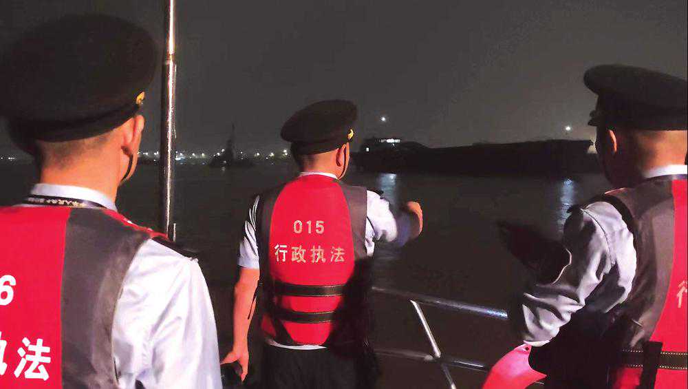 查处非法过驳砂石船舶22时15分,执法队员开始第二次巡查。