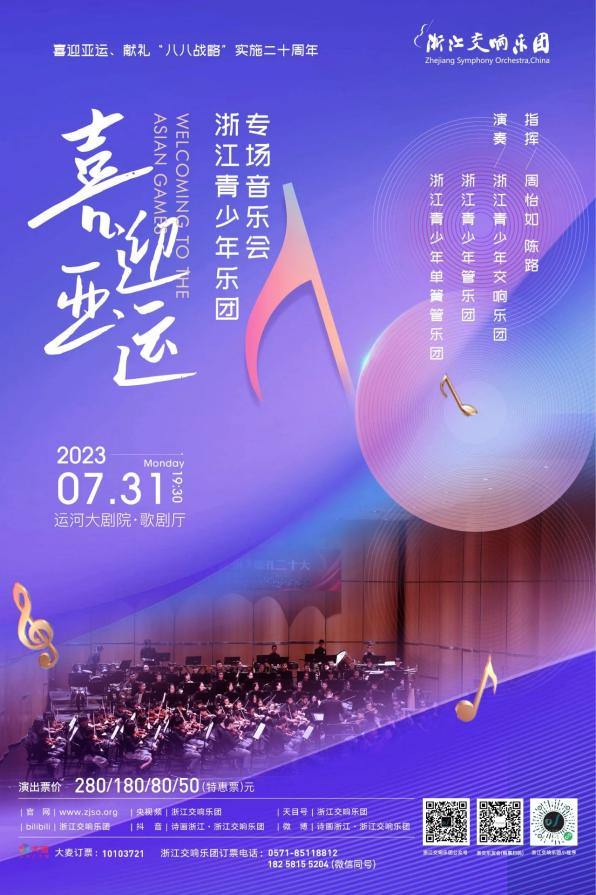 7月31日晚19:30,浙江青少年交响乐团、浙江青少年管乐团以及浙江青少年单簧管乐团(均为隶属浙江交响乐团的公益性青少年团体)将在运河大剧院·歌剧厅举行“喜迎亚运”浙江青少年乐团专场音乐会。