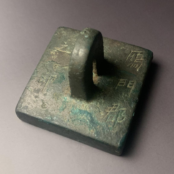 我们仔细观察这方印的鼻钮会发现,鼻钮的绳口隐隐约约能看出有磨损的痕迹。这说明鼻钮不仅是方便盖印时把握力度,同时可以看出,当时的官吏为了使用和携带方便,确实是用绳子拴系着鼻钮的,类似当今时髦女孩的手机链。用放大镜还可以看到鼻钮绳孔内侧,沉淀着微量的泥沙,已经和锈斑锈蚀融合在一起了。