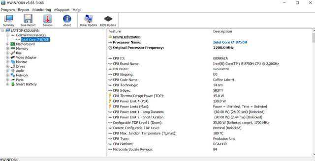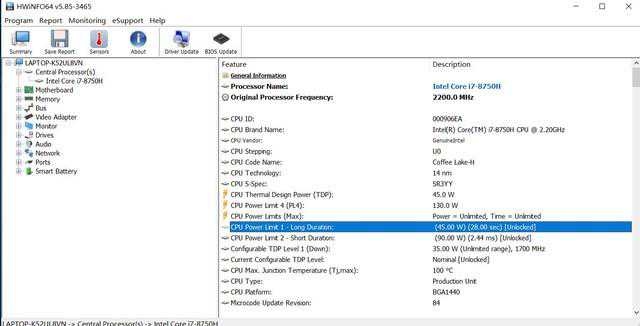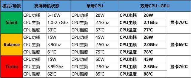 在Turbo模式下,Hwinfo检测PL1为60W,PL2为90W,激进得不像个超薄游戏本,很多比他厚的产品都不敢做这样的调度模式。该模式下CPU待机频率3.99Ghz、功耗15W、核心温度61度;单烤CPU频率3.29Ghz、功耗60W、核心温度85度;双烤CPU频率2.5Ghz、功耗45W、核心温度88度,显卡温度76度。