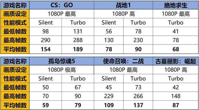 实际的游戏测试方面,这次就不扯趣味解说游戏了,直接一个表格给大家亮数据,除了为达到最佳效果建议开性能模式的《古墓丽影:崛起》和《绝地求生:大逃杀》外,《战地1》、《使命召唤:二战》、《孤岛惊魂5》、《反恐精英:全球攻势》全都测试了Turbo和Silent两种模式下游戏表现。