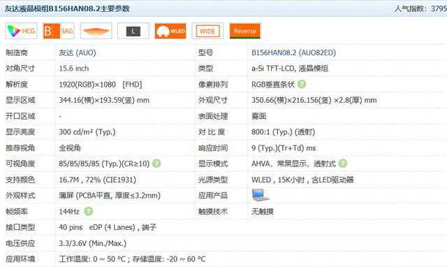 我手上送测的产品是一块来自友达的15.6英寸全高清雾面IPS屏,拥有3ms高响应时间、144Hz高刷新率、100%sRGB高色域的“三高”电竞级水准。不过美中不足的是,这次的冰刃3取消了之前一直配备的G-Sync功能,在高速画面抗撕裂方面表现可能不够完美,砍掉这个功能着实有些不应该。