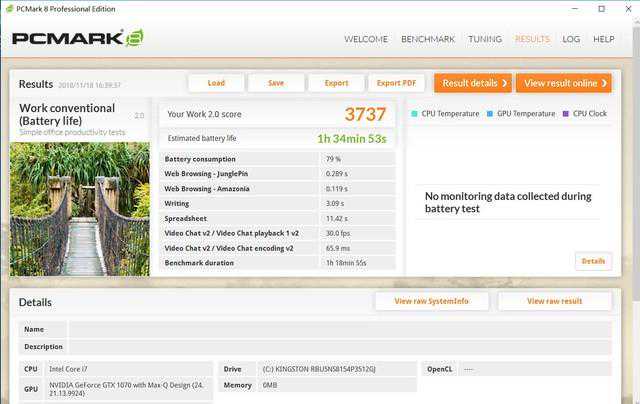 PCMark8续航测试成绩1小时34分53秒,不是很理想,一方面没有关闭144Hz快显和WLAN,另一方面这个配置确实不可能奢望有太好的续航。