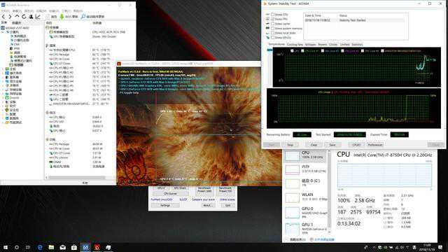在Silent模式下,Hwinfo检测PL1为35W,PL2为45W,在这一模式下CPU和GPU都趋向保守,双烤时可以看到Furmark画面略有卡顿。CPU待机频率1.0-2.7Ghz跳动、功耗5-10W、核心温度53度;单烤CPU频率2.1Ghz、功耗28W、核心温度67度;双烤CPU频率2.1Ghz、功耗28W、核心温度77度,显卡温度70度。