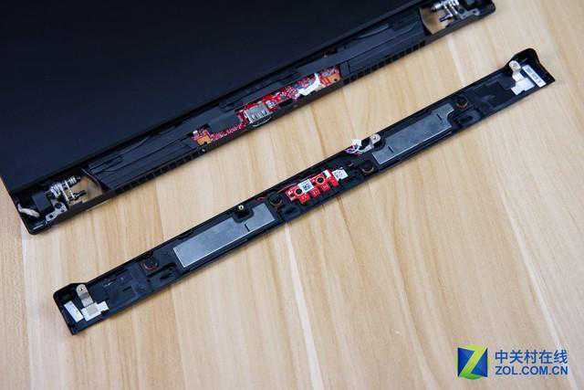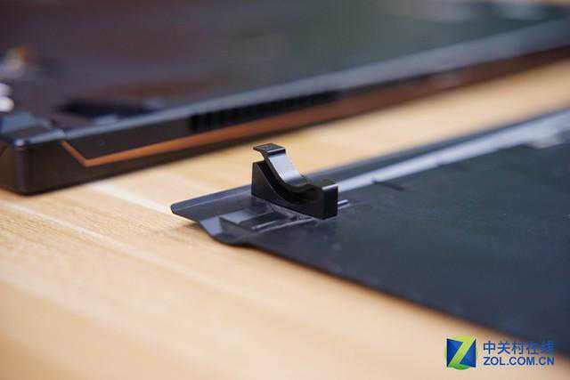 这种转轴设计的好处在于盒盖后转轴的主体部分与整机平行,可以让产品做的更薄,在很多评测中被人忽视的这一点恰恰是冰刃3可以做薄的关键因素之一。在之前的某款全球最薄笔记本上见到过,同时这种转轴的阻尼也更为柔和,开合时感受不到割裂和顿挫感。