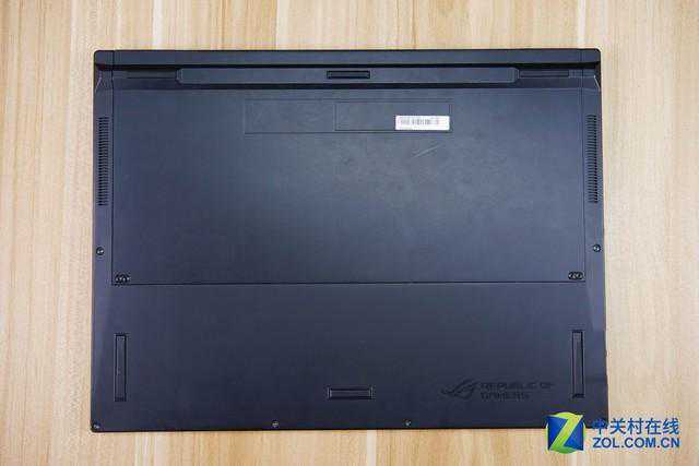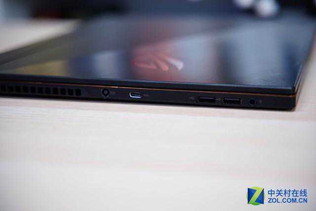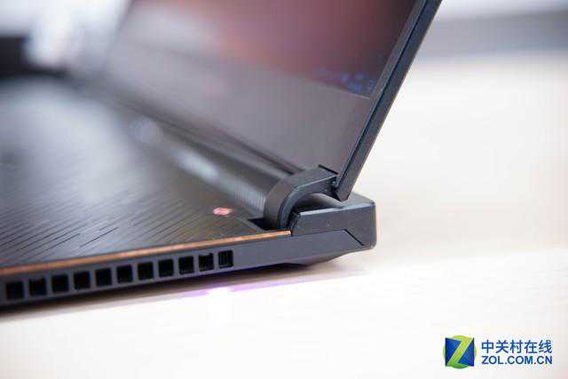 也正因为这样的设计,ROG冰刃3的后面多了个小“屁股”,双扬声器也被转移到这个位置,扬声器开孔在转轴部分凸起处,声音朝向使用者,进一步增强了立体感。同时接口也被放在了尾部正中间。