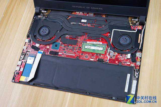 此外,传统笔记本在散热设计上都要或多或少考虑键盘区域温度。而冰刃3这类Max-Q显卡超薄笔记本设计上没有了键盘温度的束缚,可以在C面上半部分尽情的堆叠更豪华的散热模组,进而让硬件性能释放更充分。比如冰刃3拆机就可以看到如图的豪华散热模组。