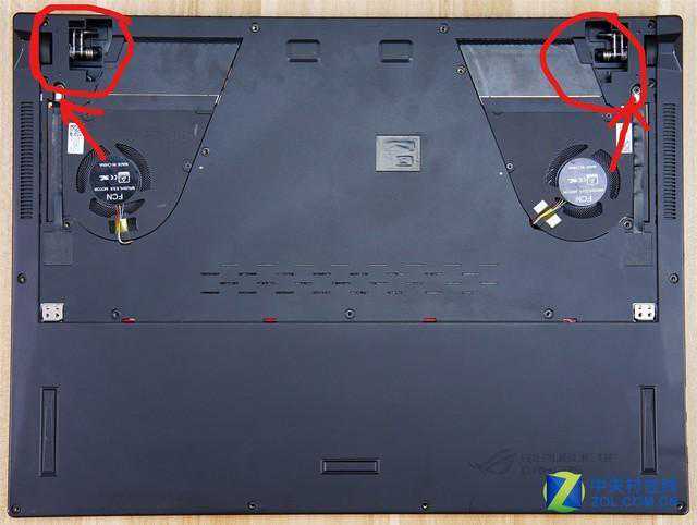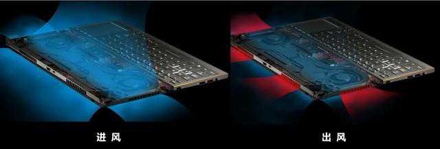 ROG冰刃系列家族式的AAS散热+开放底壳,其本质是利用开盖时转轴撑起底壳充当进风口作用,与C面大面积的进风区域结合。具体的进出风情况参考下图,蓝色为进风,红色为出风。不过这种散热方式最大的问题就是积灰,从拆开盖板后的情况看,从底面大量积灰的可能性不大。