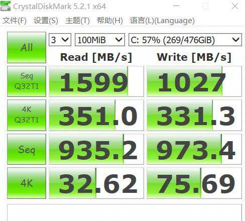 固态硬盘使用的是一块金士顿的,之前测试的产品还有搭载西部数据类似速度的固态硬盘。总的来说够用,不过不够极致,如果有更高速度需求的可以自行购买固态更换。使用CrystalDiskMark测试读取速度1599M/S,写入1027M/S,使用移动固态硬盘进行互烤大文件测试没有明显的掉速。