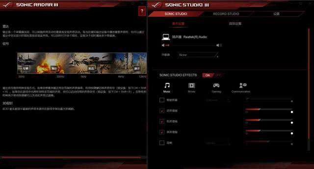 除了光效和性能模式的调整,ROG也为冰刃3提供了网络优化作用的GameFirstV、调节屏幕色彩的GameVisual、音效调节软件SonicStudio3、图形化音频分析SonicRadar3。这里面我最感兴趣的就是SonicRadar,要是调好了那可是PFS游戏中开挂级别的存在,不过具体适配的游戏还有待确认。