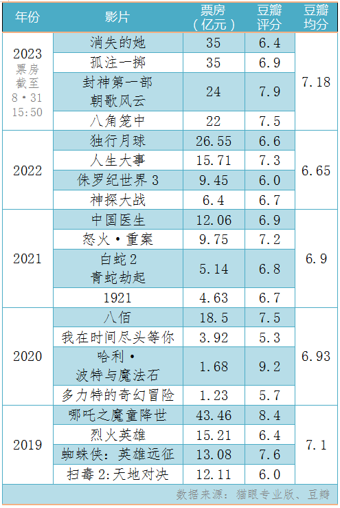 第三,通过梳理2019年~2023年暑期档票房前四名影片和豆瓣评分,可以发现今年暑期档前四部影片票房体量,不仅全部突破20亿大关,而且整体质量最为均衡。豆瓣评分虽然没有超过8分的口碑好片,但也没有低于6分的不及格片。票房前四名影片的均分,也属今年最高,影片的质量显著提高,强情绪、强话题性也带动了影片的传播效应。