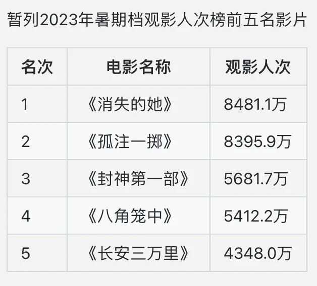 第二,今年暑期档影片类型丰富,从青少年喜闻乐见的《长安三万里》到中青年喜爱的《消失的她》《热烈》,再到讲述老年人爱情的《我爱你!》,各年龄层次的观影需求都被满足;