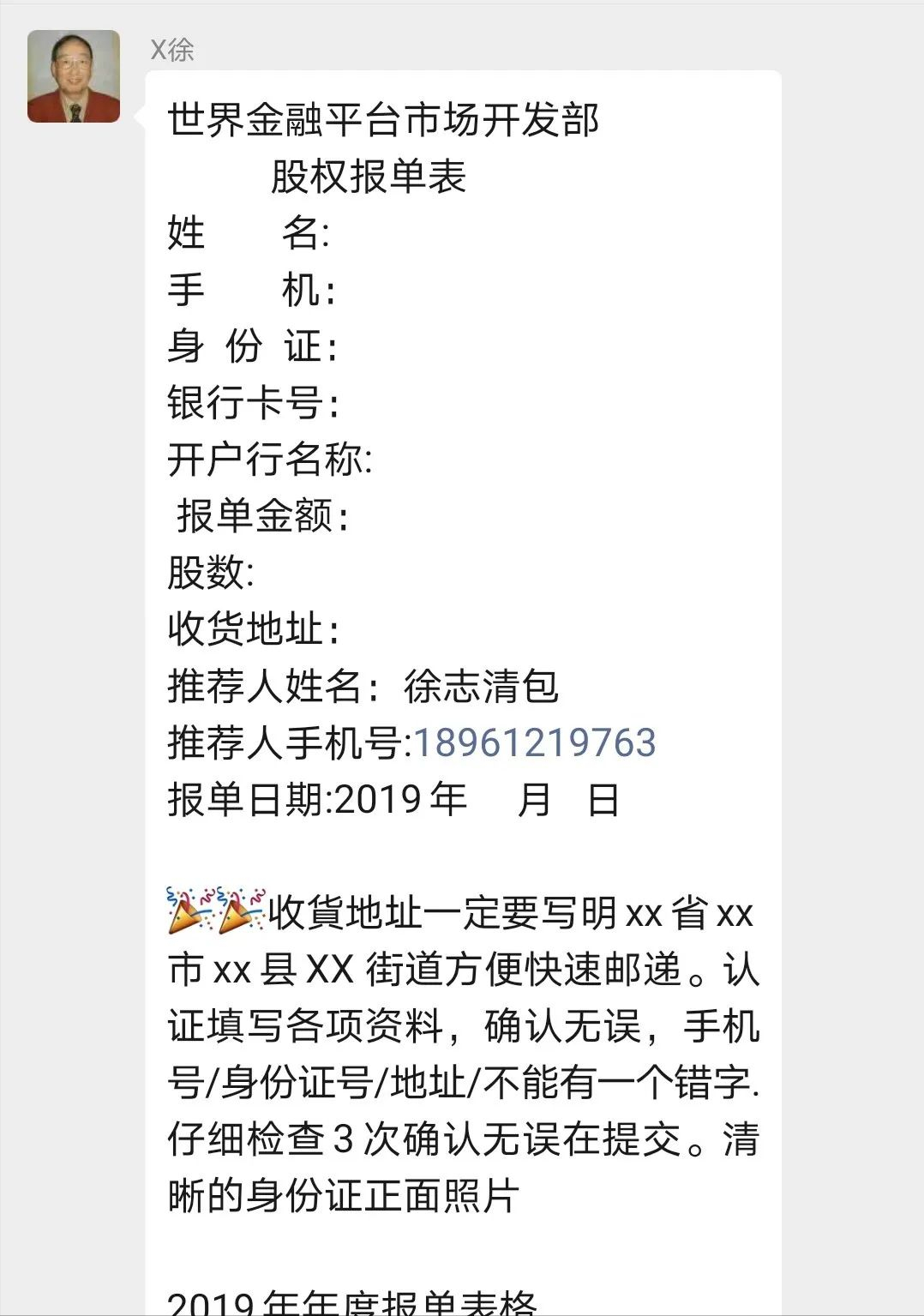 第四部分:一个投资样表。上面需填写:姓名、身份证号码、投资金额,推荐人的姓名和电话已经预填。请记住,但凡微信群里发这种东西的100%是骗子!