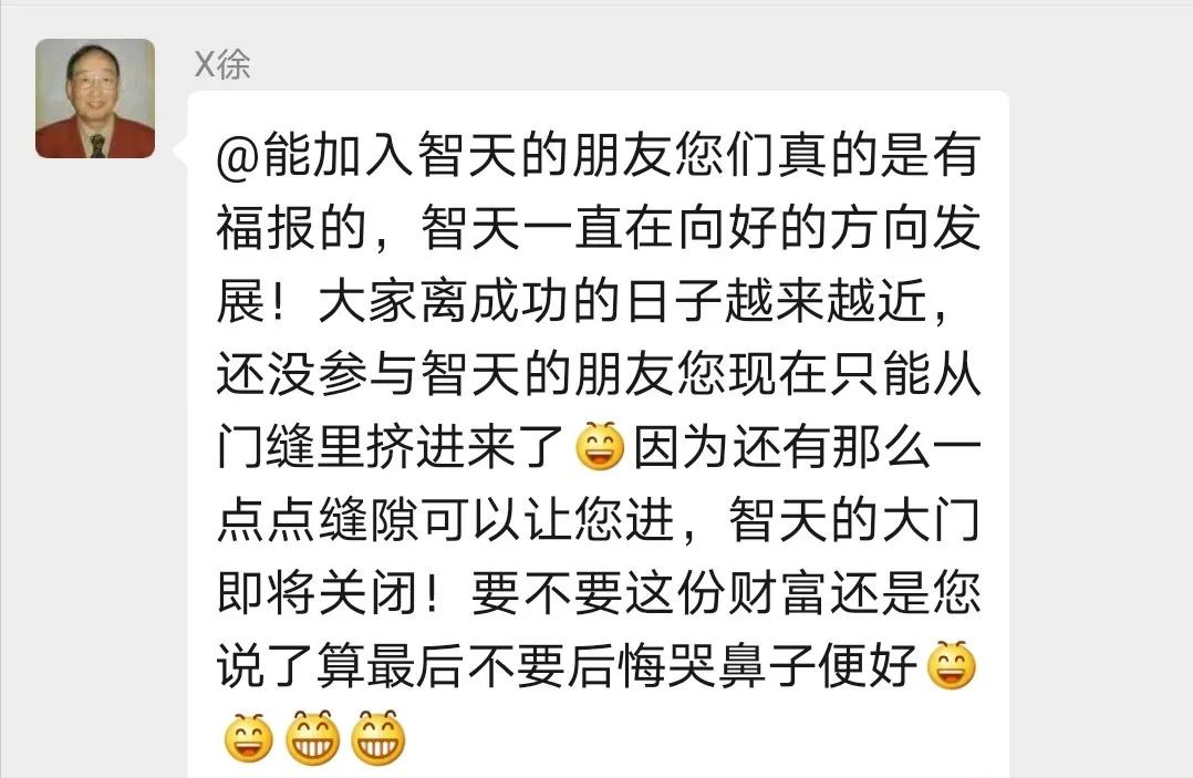 为此变身“余则成”,潜伏在这些神秘的微信群里,终于慢慢地了解:微信群是如何成为“传销洗脑神器”的?下面,就以“智天金融群”为例写上一篇,其他的传销诈骗群基本类似。