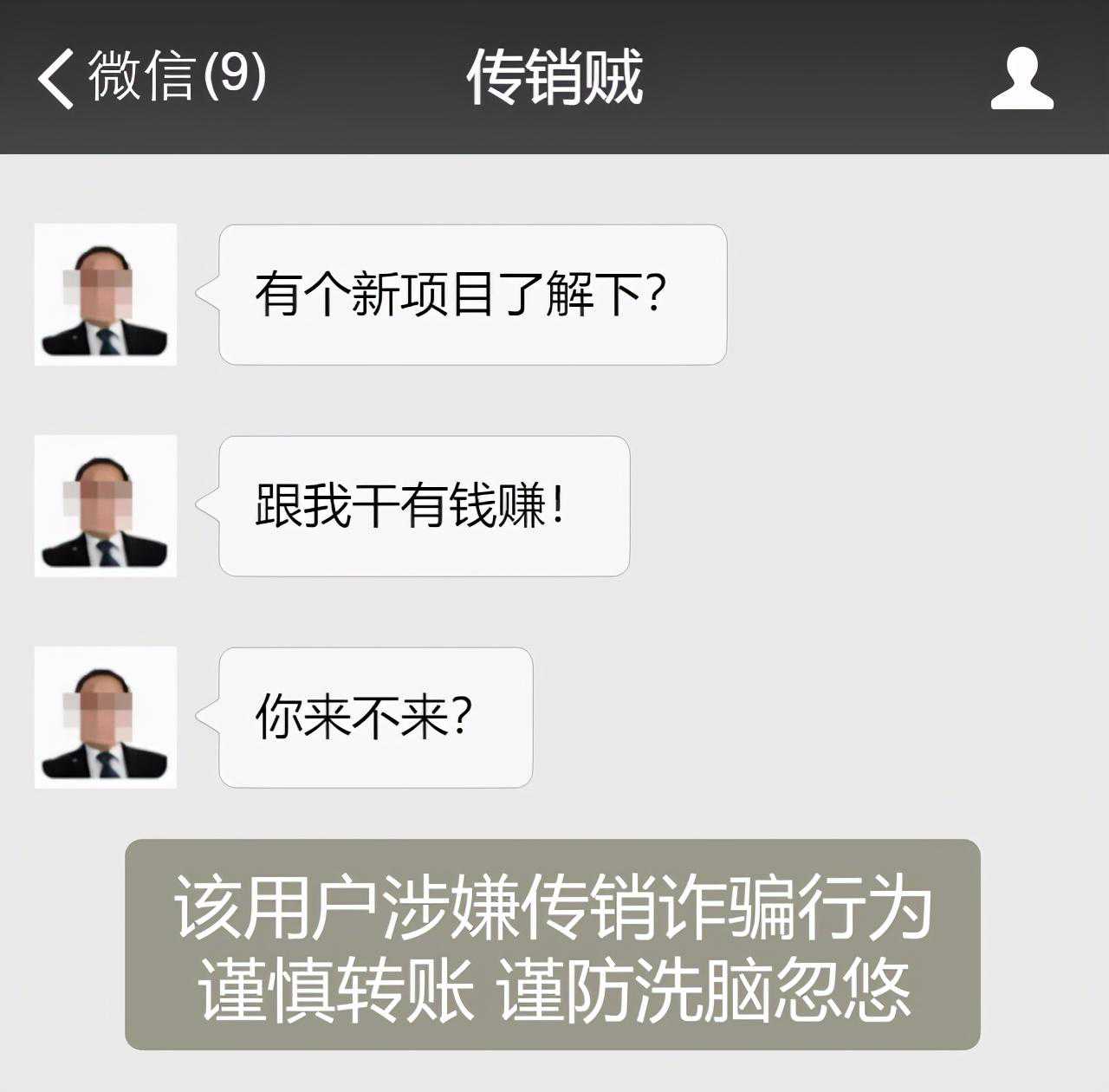 对于那些长期混迹在传销诈骗圈内的微信账号,就应该有个明显的标注,如【该用户涉嫌传销诈骗,涉及钱财谨慎转账】、【该用户涉嫌传销拉人头违法行为,请谨慎对待,勿被洗脑迷惑】等提示信息。