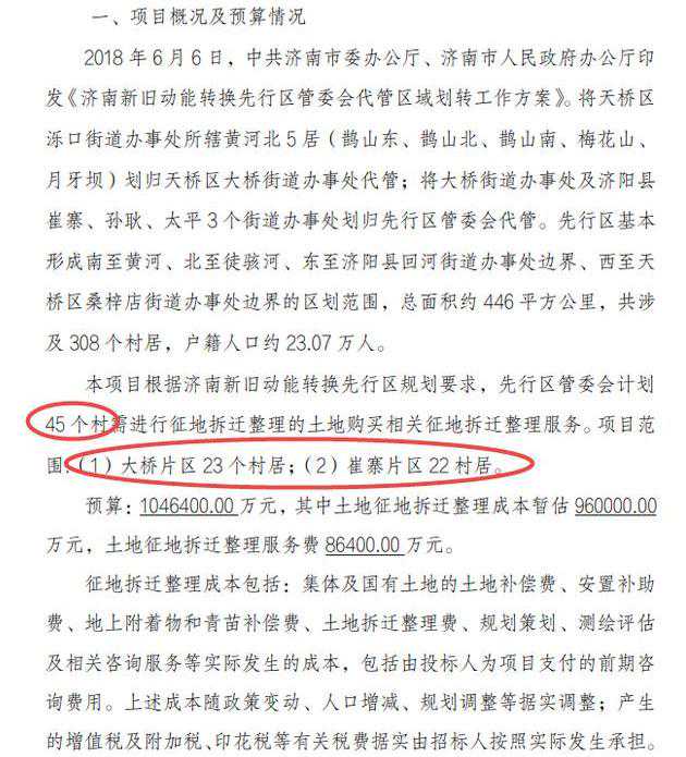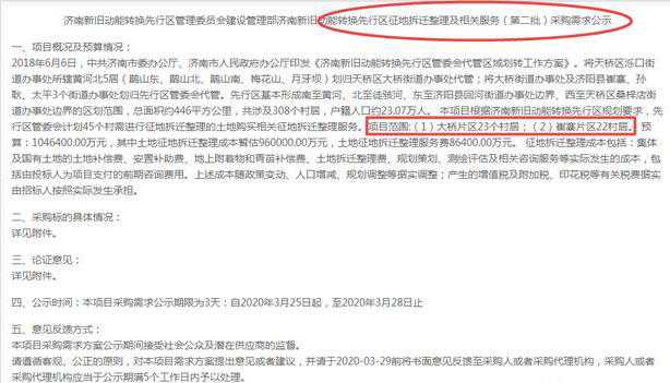 3月25日,政府采购网发布了“济南新旧动能转换先行区征地拆迁整理及相关服务(第二批)采购需求公示”,需求公示提及根据济南新旧动能转换先行区规划要求,先行区管委会计划45个村需进行征地拆迁整理的土地购买相关征地拆迁整理服务。