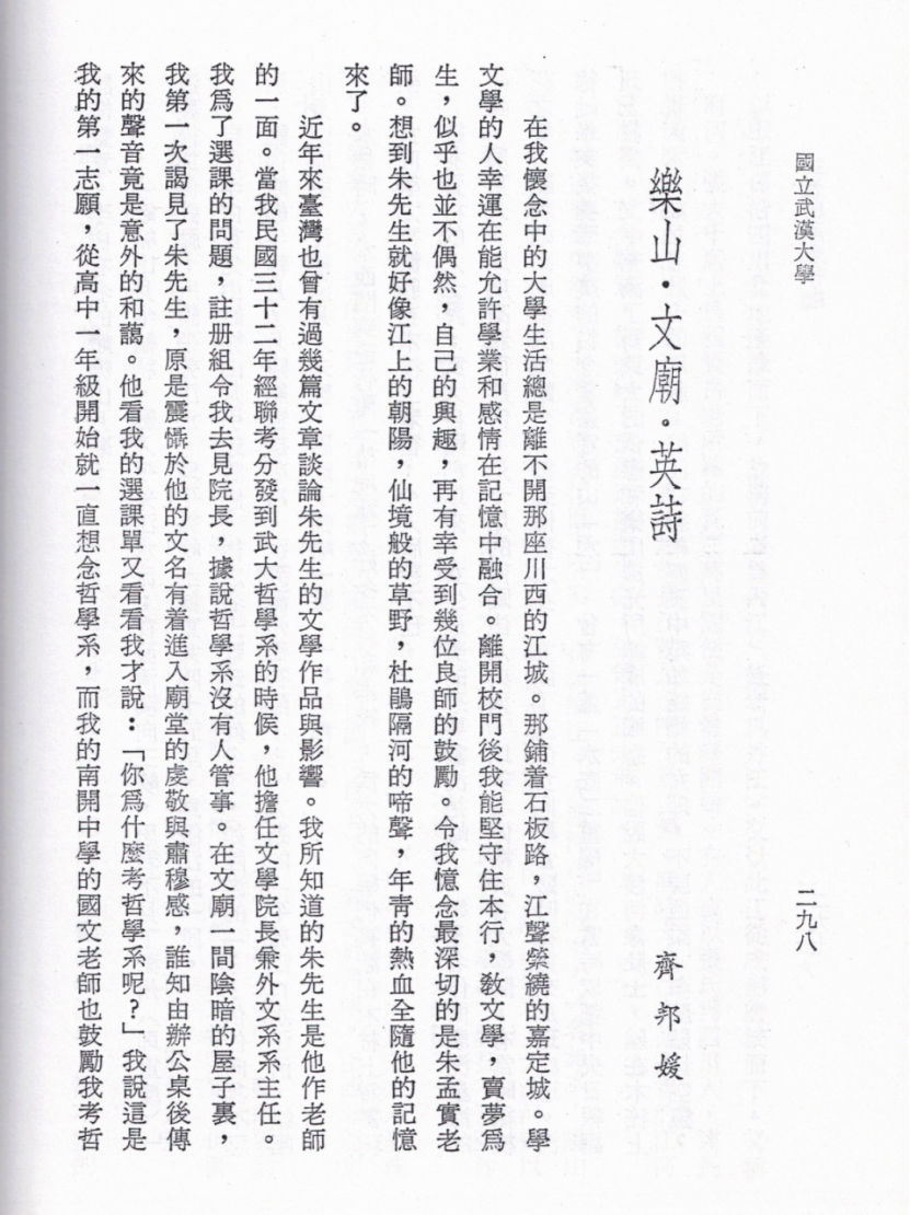 在这本书中,也收录了齐邦媛所撰《大学生活今昔谈》《乐山·文庙·英诗》等文。她在《乐山·文庙·英诗》中写道,每当忆起朱光潜先生,“就好像江上的朝阳,仙境般的野草,杜鹃隔河的啼声,年青的热血全随他的记忆来了。”在《大学生活今昔谈》一文中,她由大学毕业初到台湾的心境谈起,娓娓回忆了乐山武汉大学时的点点滴滴:“我们在乐山时代没有影剧,而自得其乐的方式很多。黄昏在大渡河畔木材堆上谈爱情,谈人生,谈许多虚无缥缈的观念,日子过得很充实。周末看同学演话剧,开音乐会、联欢会,而宿舍晚关门的深夜,结伙踏石板路唱歌回去的青春,确有更亮的人性光辉……我反而觉得我们这一代很幸运,能亲身经历抗战时期虽艰辛而发奋的生活,又有幸看到世界飞跃的进步,我们在台湾的丰衣足食也是当年所梦想不到的。”这些温情而深沉的文字,可谓三十年后《巨流河》中武大篇章的雏形。
