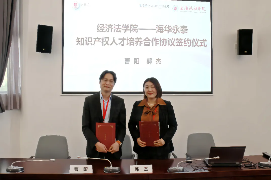 在双方代表见证下,曹阳教授与郭杰律师签订了经济法学院——海华永泰律师知识产权人才培养合作协议。共同促进法学教育、理论研究、司法实务相结合,走进高校,通力合作培养知识产权人才。