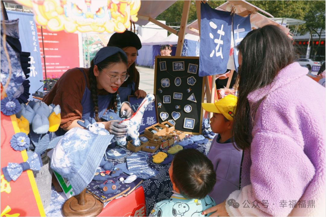 在古法蓝染展示台,各类琳琅满目的文创产品格外“吸睛”,鲜活灵动的龙布偶,独具特色的手工艺品,留住了不少市民的脚步。手工艺人王旭丹热情地为大家介绍非遗蓝染技艺。