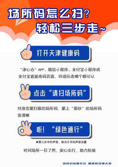 当前,疫情防控形势仍旧不容放松,市民在落实好佩戴口罩、社交距离、个人卫生等防疫“三件套”的同时,还需要继续坚持做好重点场所的天津“健康码”场所码扫码,用您一个小小的动作,进一步提升疫情防控的精准性,加......