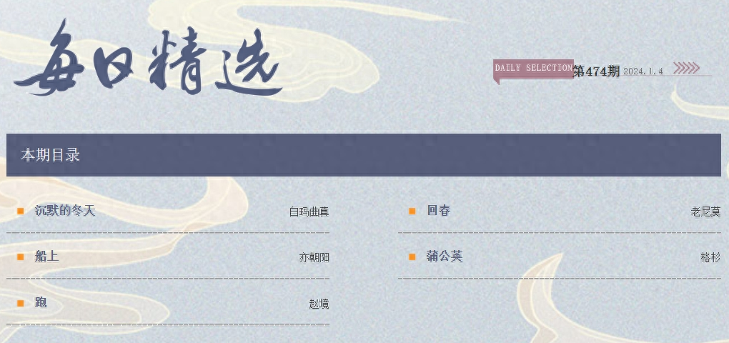 "每日精选"是由《诗刊》社中国诗歌网值班编辑从众多投稿中精选的作品,经编辑部审核通过后汇编而成。