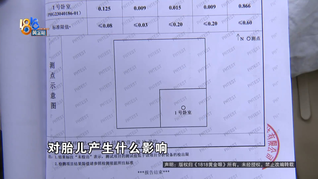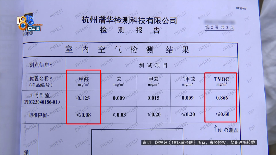 何女士:找了专业的检测机构,4月28日去检测这个房子,上门检测的,出具的这个检测报告上面显示,它的甲醛还有TVOC是超标的。