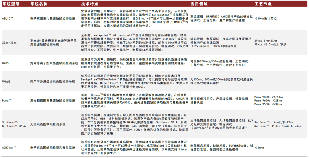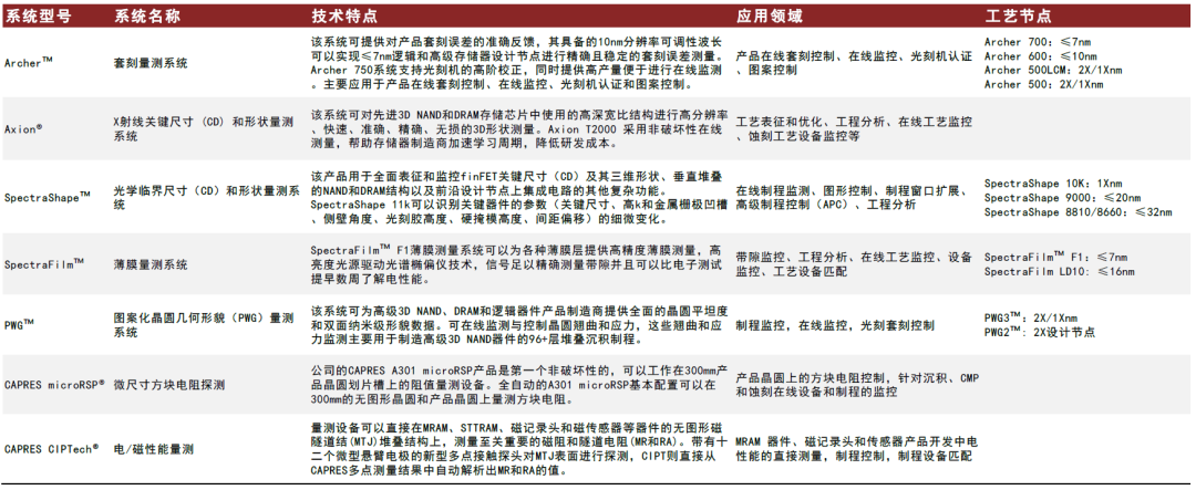 前道量检测作为公司最先布局的领域,KLA产品类型广泛,涵盖衬底、光罩、芯片以及基板的研发设计和加工量产完整过程中的工艺控制。公司针对制造环节不同环节的关键工艺分别设计出针对性产品,其工艺水平既包括2xnm及以上的成熟制程,又支持EUV技术5nm以下节点芯片的过程监控。1)在缺陷检测与复检领域,公司的缺陷检测及复检设备支持各类型芯片的生产,包括高级逻辑芯片、DRAM芯片、3DNAND芯片、功率芯片、MEMS等。检查和复检工具主要用于识别、定位、表征、审查和分析图案化和未图案化晶片表面的各种缺陷问题。2)在量测领域,公司的量测系统满足了一系列芯片和基片晶圆制造应用所需,产品应用包括设计可制造性验证、新工艺表征以及批量制造工艺的监控。通过精确测量图案尺寸、薄膜厚度、层间对齐、图案位置、表面形貌和电光特性,帮助芯片制造商严格控制工艺,提高器件性能和良率。
