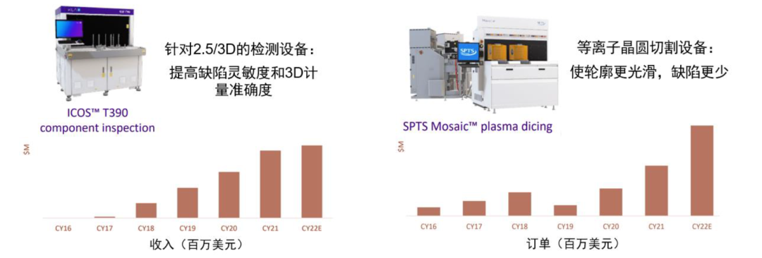 公司的半导体制造设备业务主要提供蚀刻、等离子切割、薄膜沉积等晶圆加工技术和解决方案。该部门组建于2019年,公司借助奥宝科技旗下的SPTS部门,在沉积蚀刻设备领域的优势进一步发展而来。其主要产品包括等离子切割设备、先进真空沉积设备以及蚀刻工艺设备的开发及销售,服务于包括MEMS、LED、功率半导体和高速RF-IC生产制造及先进封装在内的广泛终端市场。