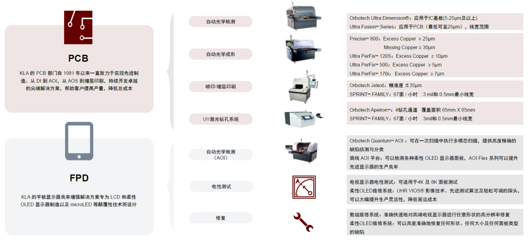 公司的PCB、FPD产品线主要来自于2019年针对奥宝科技的战略并购。其中PCB产品可为客户提供直接成像、自动光学检测、光学成形、喷印/增层印刷以及UV激光钻孔系统的制造和工程解决方案。FPD产品则可以用于识别和分类缺陷的检查和电气测试系统,以及用于修复显示器市场缺陷的系统。