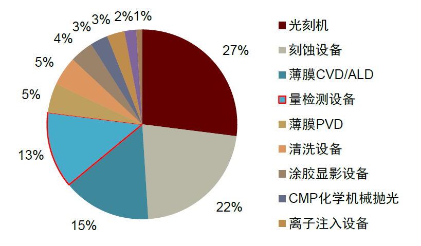 量检测设备市场约占半导体设备市场的13%。光刻、刻蚀和薄膜沉积是半导体前道制造中最重要的三个环节,根据Gartner,2020年全球前道设备中,光刻机、刻蚀设备和薄膜沉积设备投资占比分别为27%、22%和20%(含CVD和ALD15%、PVD5%)。量检测设备的市场占比仅次于上述三类设备,为13%。