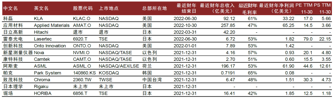 ►创新科技(OntoInnovation):创新科技由纳米技术(Nanometrics)和鲁道夫(RudolphTechnologies)于2019年合并而成(股票代码ONTO),总部位于美国。其中,纳米技术成立于1975年,1984年上市,主要提供紫外光学量检测设备;鲁道夫成立于1940年,1999年上市,主要提供宏观检测、光刻以及可见光学量检测设备。两家公司的产品互为补充,完善了创新科技的产品线,覆盖了从前道光刻工艺至中后道先进封装量检测设备。FY22(结束于2022年1月1日)公司收入7.89亿美元。