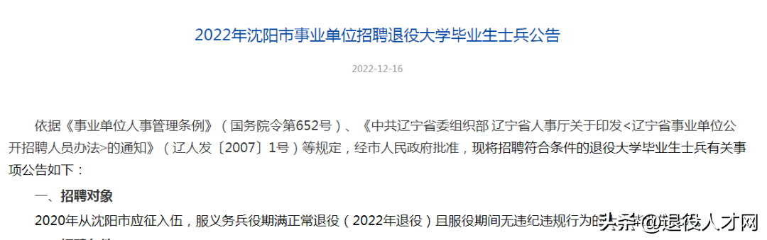 四是事业单位招考,有的城市会有退役士兵专项岗位。比如2022年沈阳事业单位招聘退役大学生士兵公告,明确招聘对象为退役大学生士兵。