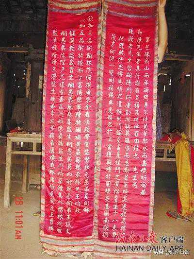 这是清末民初海南寿礼文化遗存大汇集,这是羊山寿诞礼仪习俗大展示。通过寿诞的题颂文字,我们知道吴汝功曾被“敕封修职郎”,古稀之年社会交往还很活跃。从“前清例授布政司‘照磨’……”的题颂中了解到,耄耋之年的吴汝功在羊山地区享有盛誉。