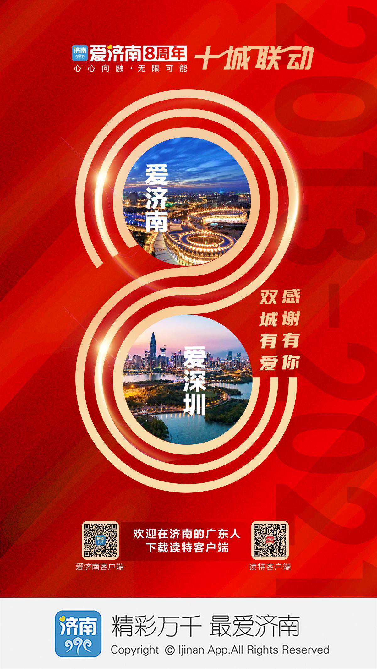 今天,为爱济南送来生日祝福的是读特客户端。作为深圳报业集团倾力打造的深圳门户客户端、深圳市委市政府权威新闻的移动发布平台,读特客户端立足深圳,聚焦中国改革开放的实践与探索,以发出主流权威声音,传播社会正能量,唱响深圳好声音为己任。技术赋能,内容引领,不断升级迭代,从单一新闻客户端,逐渐发展成为“新闻资讯+互动服务”的综合客户端,下载量突破2100万,服务粤港澳大湾区,辐射影响全国和全世界。在此,我们真诚邀请身在鹏城的济南人、身在泉城的深圳人下载爱济南客户端和读特客户端,为两座城市的发展摇旗呐喊,共见辉煌。