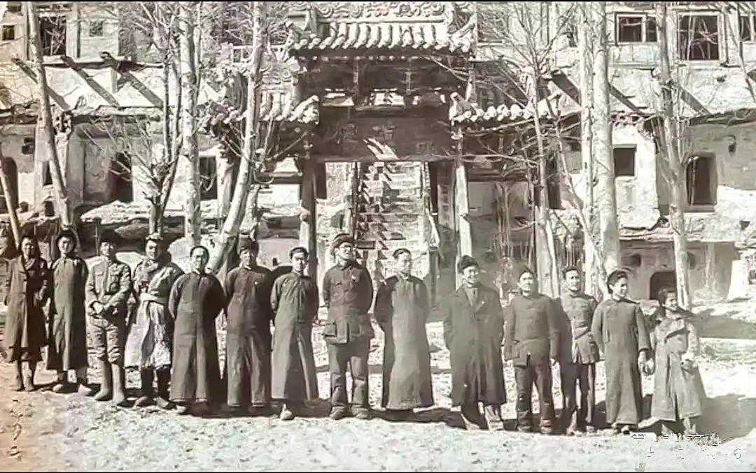 1944年元旦,敦煌艺术研究所职工在窟前合影,右二为邵芳