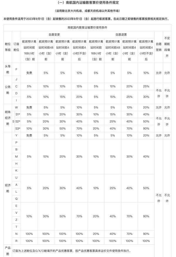 以提前168小时(7天)自愿变更为例,新版规则大多数舱位将免收手续费,仅明珠经济舱S3舱位以及经济舱E/V/Z/T/N/R舱位需支付5%的手续费,而按照旧版规则,仅头等舱、公务舱J舱位、明珠经济舱W舱位、经济舱Y舱位免收手续费,经济舱N/R舱位需支付100%的手续费。