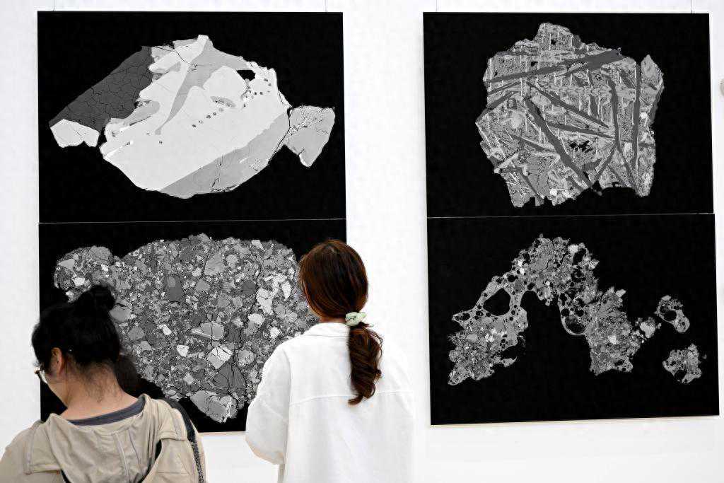 2023年4月19日,观众在《阅壤——月壤科研成果主题艺术展》展览上,观看月壤颗粒扫描电子显微镜背散射全景照片。新华社记者黄博涵摄